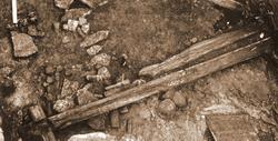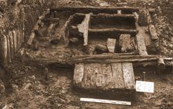 Сруб №5, построенный в 60-е годы XIII в., и подкладочные камни под несохранившуюся деревянную постройку (раскоп по ул.Советская, 5, 2001 г.)