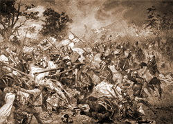 | Летом 1410 г. в знаменитой битве под Грюнвальдом соединенная армия Ягайло и Витовта наголову разгромила войско Тевтонского ордена. |