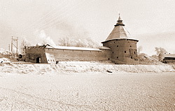 Мы уже привыкли, к тому, что есть в Пскове старая руина – Покровская башня – грузная, одиноко подпирающая берег, заваленный цветной шелухой пивных шалманов и сопутствующих им отходов. Историческая (даже недавняя) память горожан заблокирована от воспоминаний, взгляд легко скользит туда-сюда и невольно отводится на фасадец ширмы-многоэтажки, загрузившей почти всё пространство площади Героев-десантников [ 2 ].