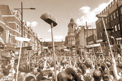 | Активные жители Лондона выражают свое отношение к властям швабрами и мётлами. |