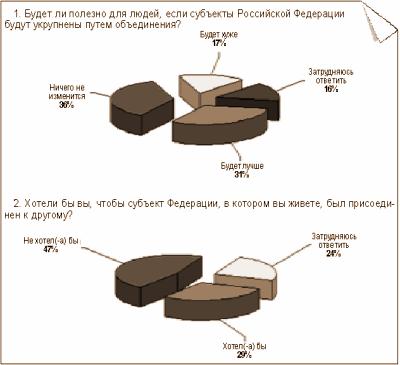 На вопрос: «А Вы лично хотели или не хотели бы, чтобы Ваша область (республика, край) объединилась с соседними областями в единый регион?» почти половина участников массового опроса (47%) и большинство экспертов (58%) дали отрицательный ответ. Хотели бы такого преобразования 29% участников массового опроса и чуть больше трети экспертов (34%).
